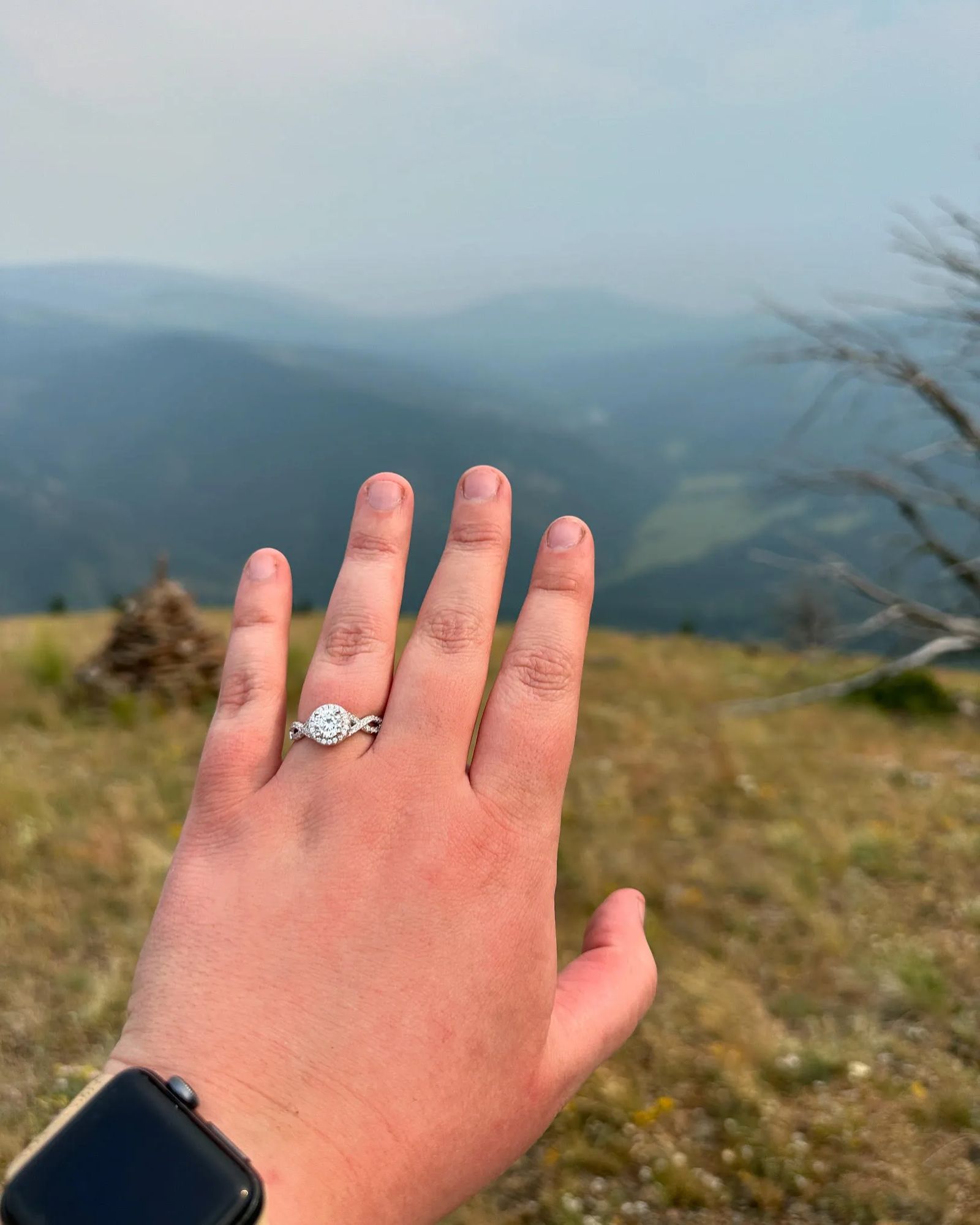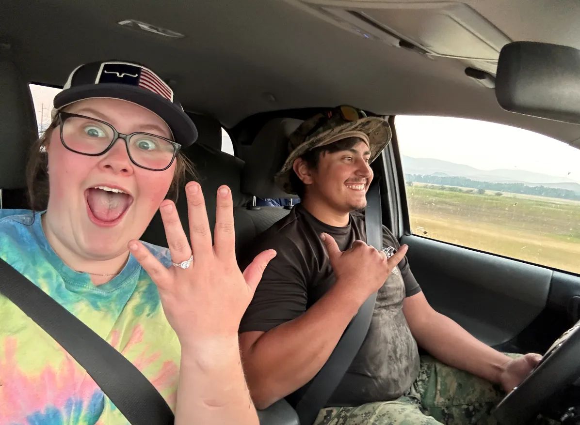 We started to go on hikes together during the spring and summer when it wasn't too hot outside. Skyler had told me about a hike that he's been doing for many years and it is one of his favorites, Mt. Elmo in the Crazy Mountains. Beginning of July, Skyler told me to take a long weekend from work at the end of that month, told me we were going to the Crazies and that his best friend Casey was coming along. On the hike we experienced many challenges but we persevered and made it to the halfway point and decided to take lunch and rest for a bit. We continued on and thought we saw a bear turned out to be a cow. We had ups and downs but we made it to the summit. Casey heads up to take a photo of us on the summit but then says " okay say Oklahoma" I get extremely confused and that is when I turn to Skyler thinking we are done and about to head down and he is getting on one knee asking me to be his wife. It truly was a surreal feeling and couldn't believe that he was proposing. I of course said yes!!