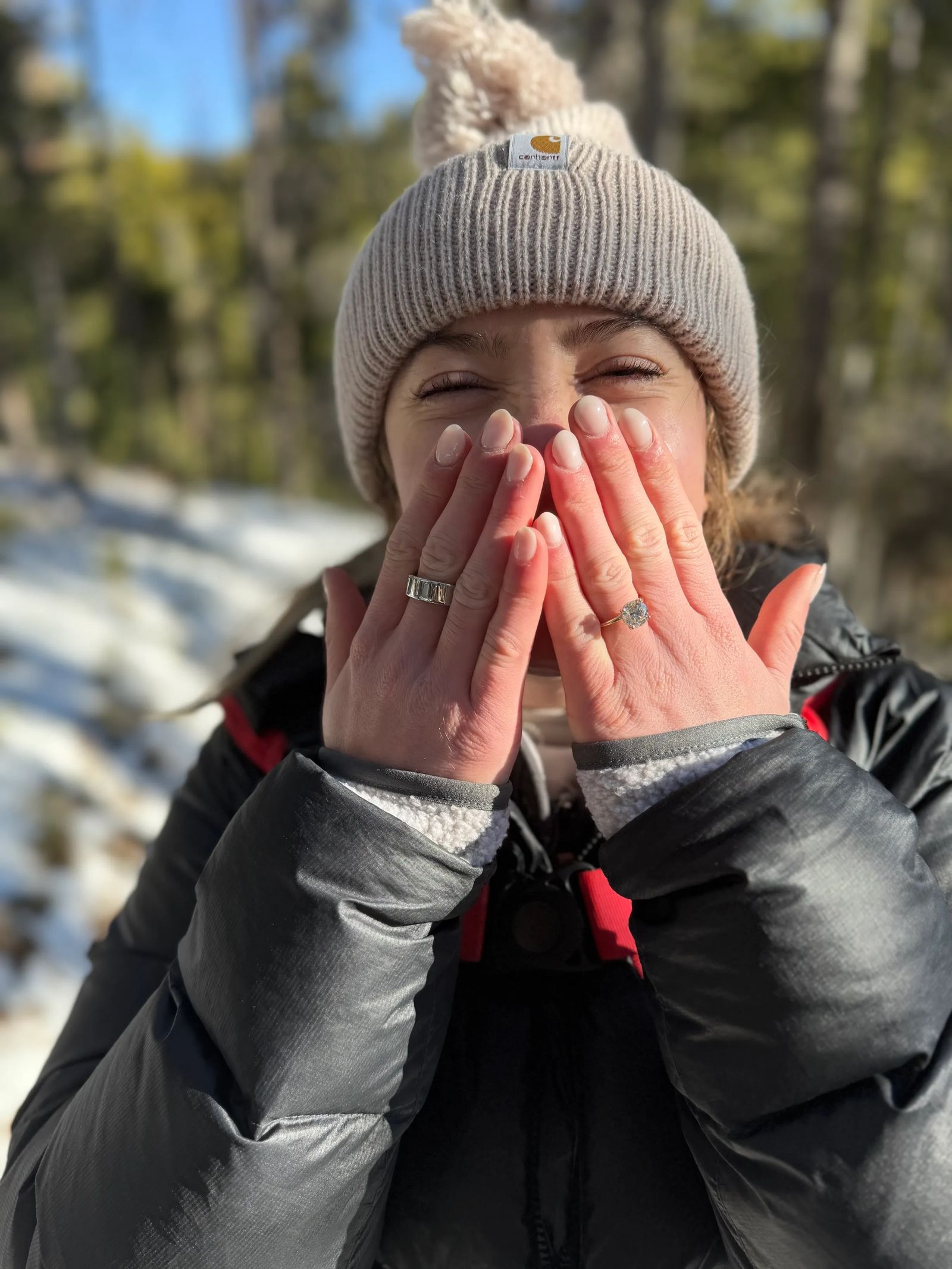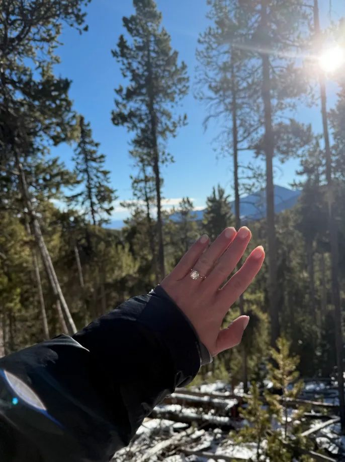 Garrett proposed to me in January in Red Lodge during a quiet, snowy hike—honestly, it was exactly how I would have dreamed it. Afterward, we spent the entire day together soaking it all in, keeping it just between us for 24 hours before sharing the news with family and friends. It made it feel even more intimate and meaningful.