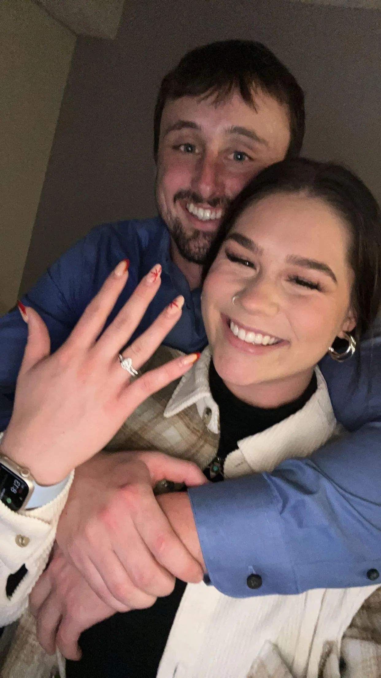 It was December and I had been back home in MT for my Christmas break. Jared and I wanted to have our own Christmas together after I got back. He came up with a plan to open up presents together at his place and then we would dress up nicely and go out on a dinner date. He was ready within seconds but I still needed to do my hair and makeup. While I was getting ready he just happened to have my favorite type of wine so he kept refilling my glass. After I was finally ready he came out with another present that he claimed he had forgotten about. As I’m unwrapping this big box, inside there was another little box wrapped, I open this Riddles jewelry box with nothing inside and I looked back at Jared and he was on one knee with the ring. I think we both blacked out after that but thankfully he got it on video so we can go back and watch it anytime, which I’m so thankful for because it was such an amazing experience for us both.